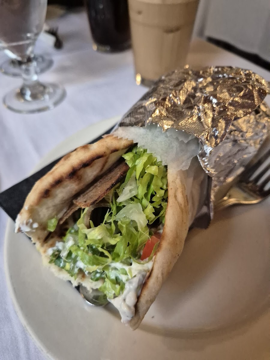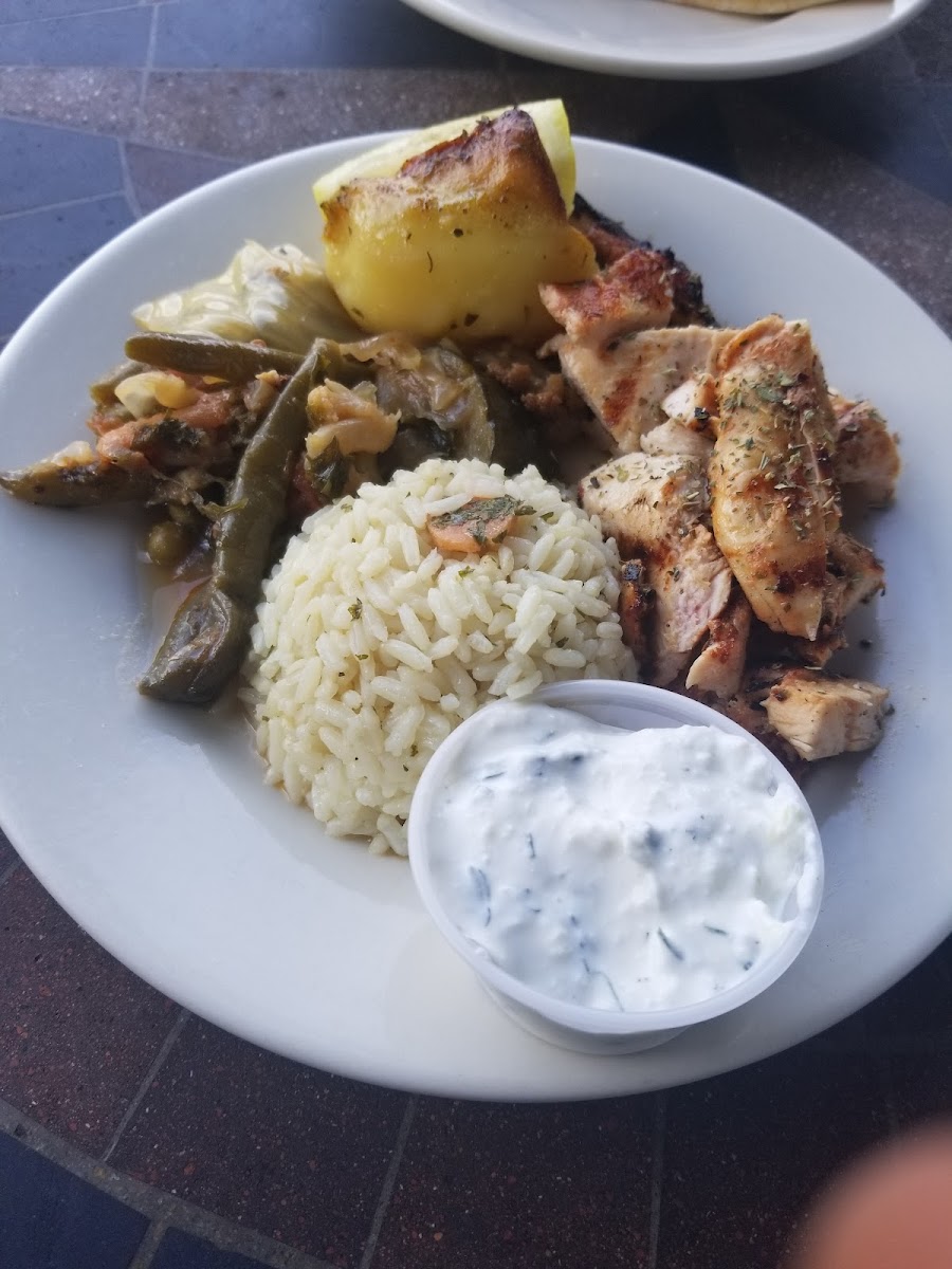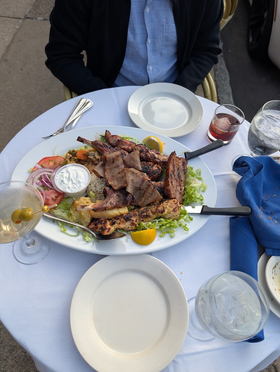 Stopped in on a lovely day to try Zorba's, sat outside at a sidewalk table. Nice crusty bread and dipping oil are served with dinner. Sampled many of their items with the charcoal grilled platter: kebabs, gyro, lamb lollipop, sausage, marinated chicken, orzo, buttery potato, and veggies. There was a lot so I might've forgotten something! All of the meats were grilled wonderfully and were still tender and flavorful. The spice / marinades are very good and will linger long after your meal reminding you how good it was. Great portion and a good deal to share. Will be back to try some of their other menu items for sure. Thanks