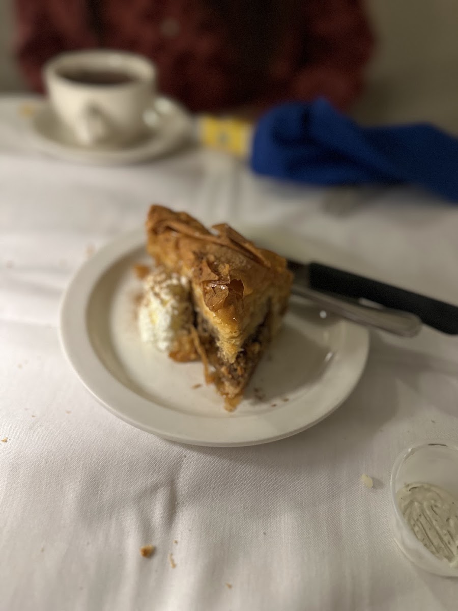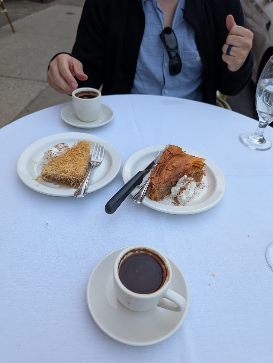 This place is a staple in Fairmount. The owner/place has been around for awhile. He definitely keeps an eye on his place (he is constantly there). I ordered a greek coffee which was pretty strong (it was basically just expresso which was quite disappointing for me because I thought it would be an americano type drink). The place has friendly staff. The place also has a small amount of space inside and a lot of outside space. The restaurant is full of Greek images which was pretty cool to see. I ordered from the lunch menu and ended up getting a charcoaled chicken platter. It had an amazingly charcoaled chicken taste. There was a side of rice and mixed veggies. My favorite part of that meal besides the charcoaled chicken was the amazing tzatziki sauce that had a bit of a mustard type kick to it. For dessert, the Galaktoboureko is to die for. It had this creamy inside with a sticky top.